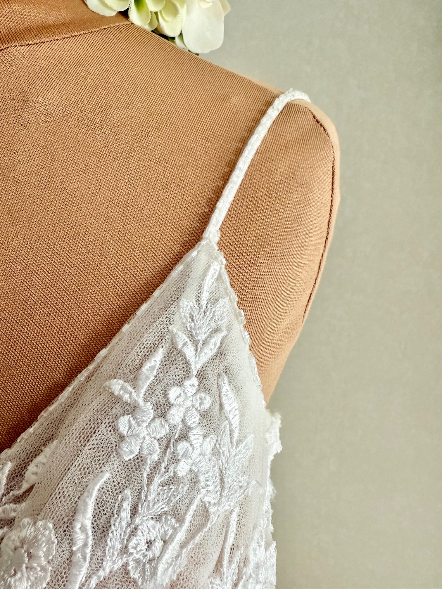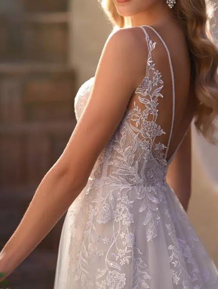 zusätzlich dezent funkelnd bestickt und mit tieferem Rückenausschnitt