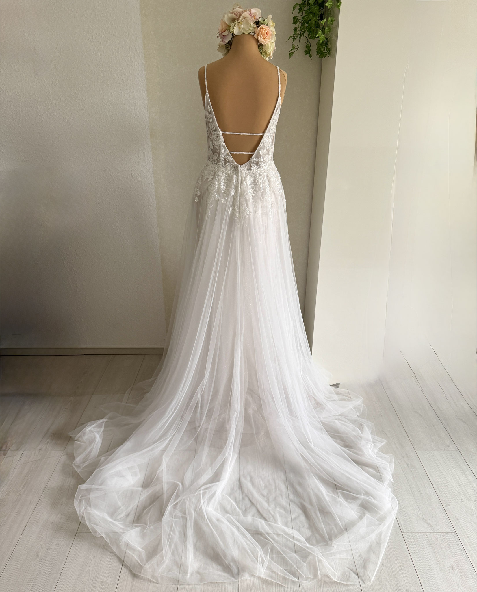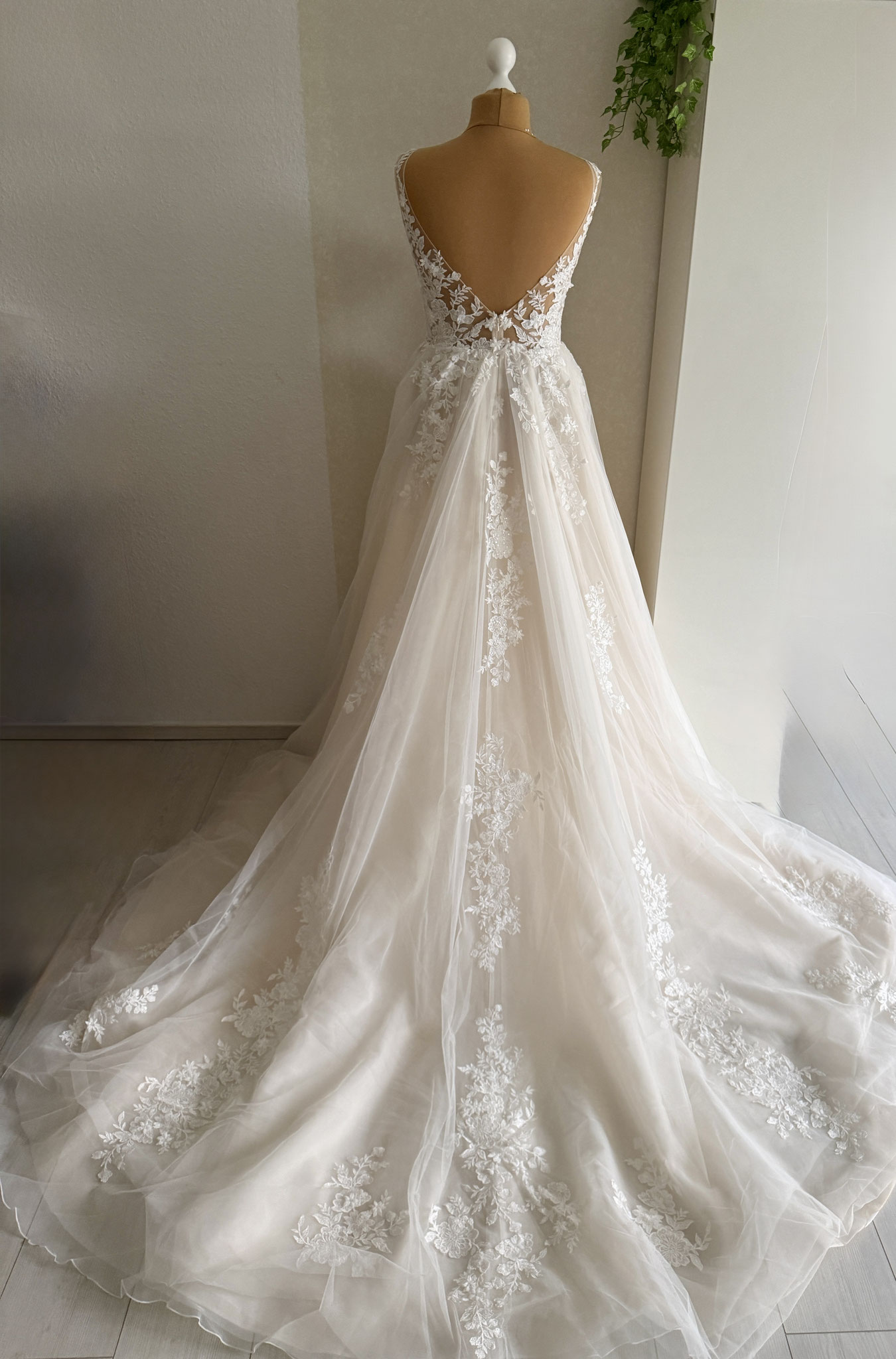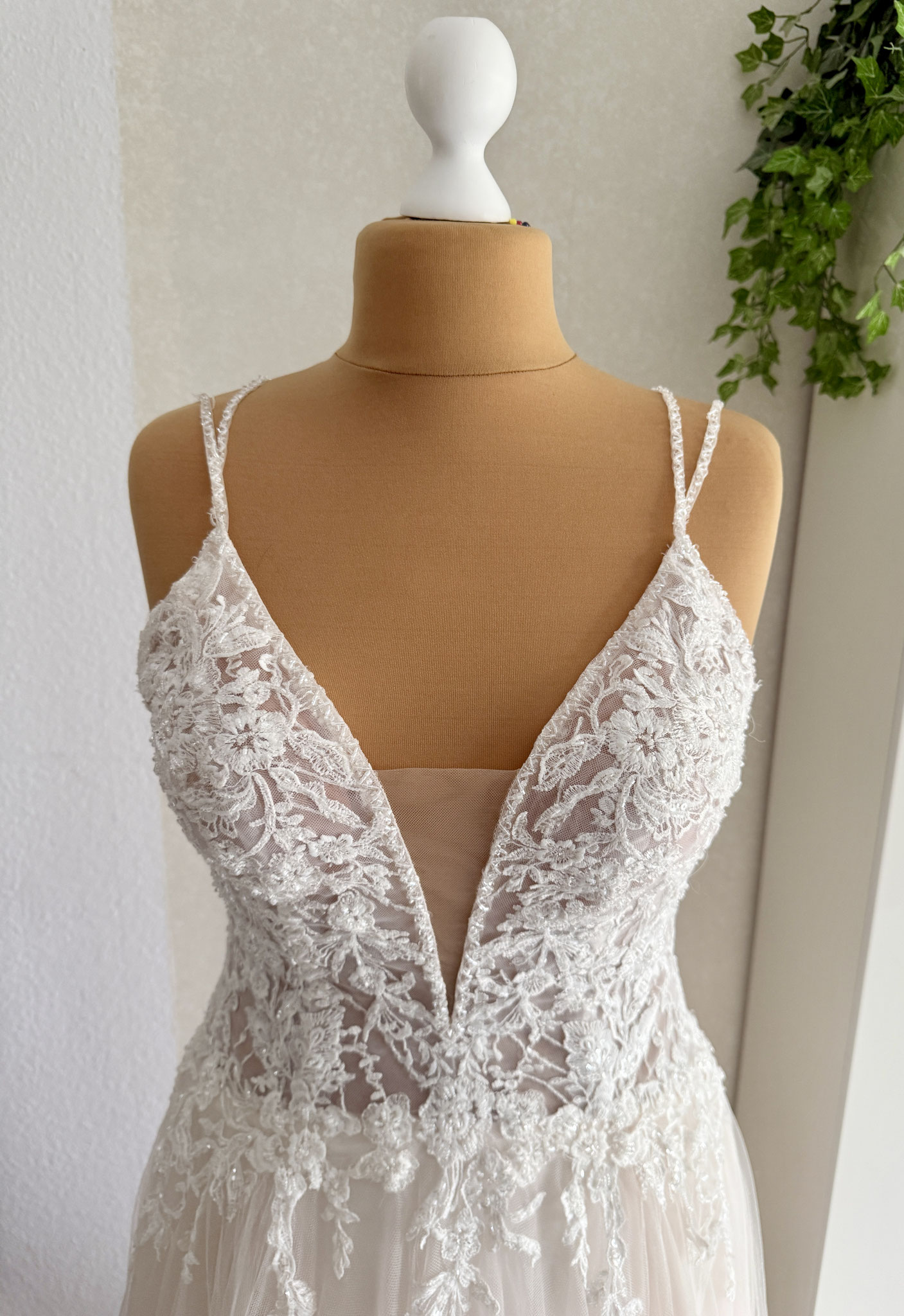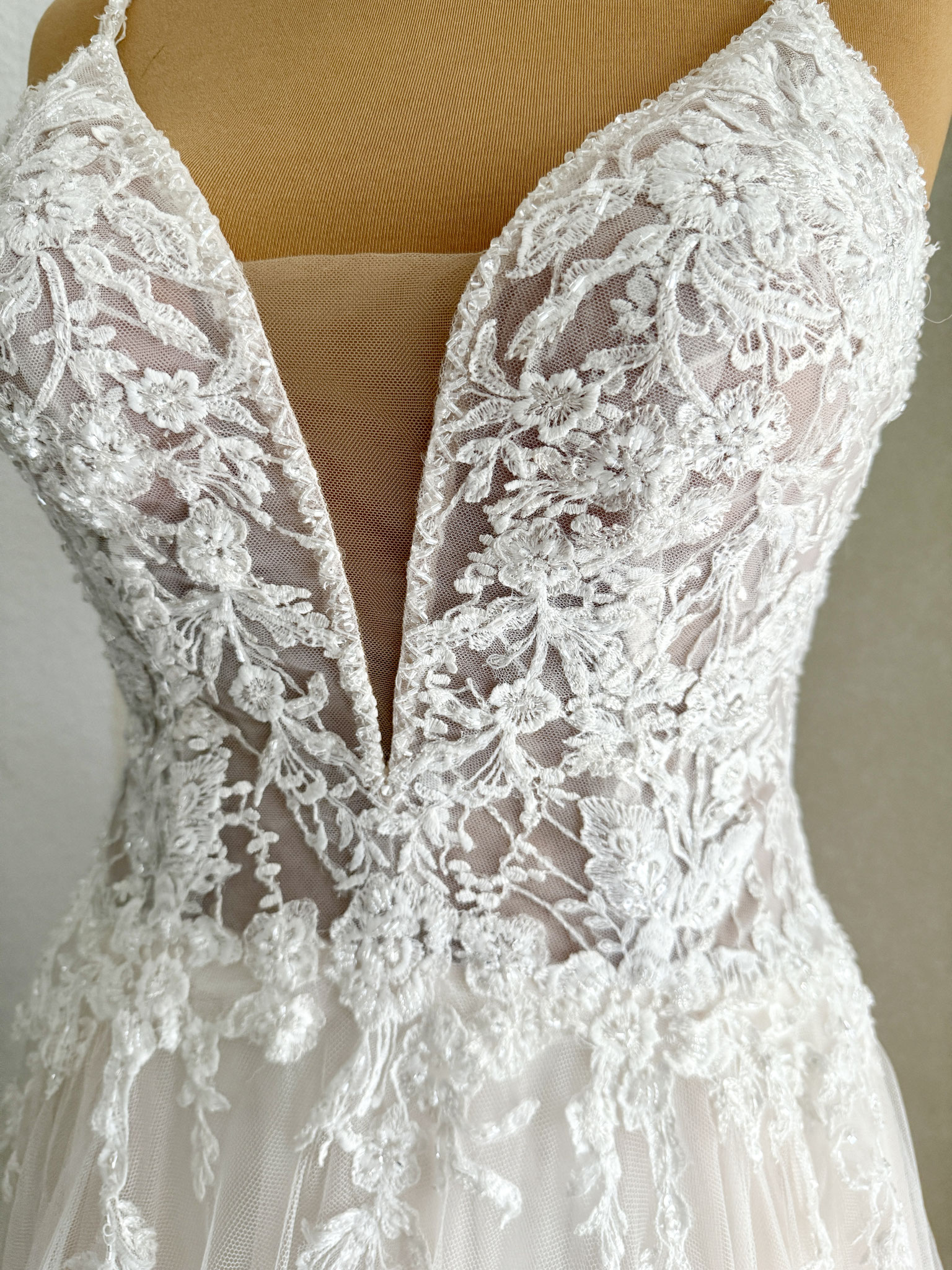 mit tollem Spitzenoberteil und Spitzendetails in der Schleppe.