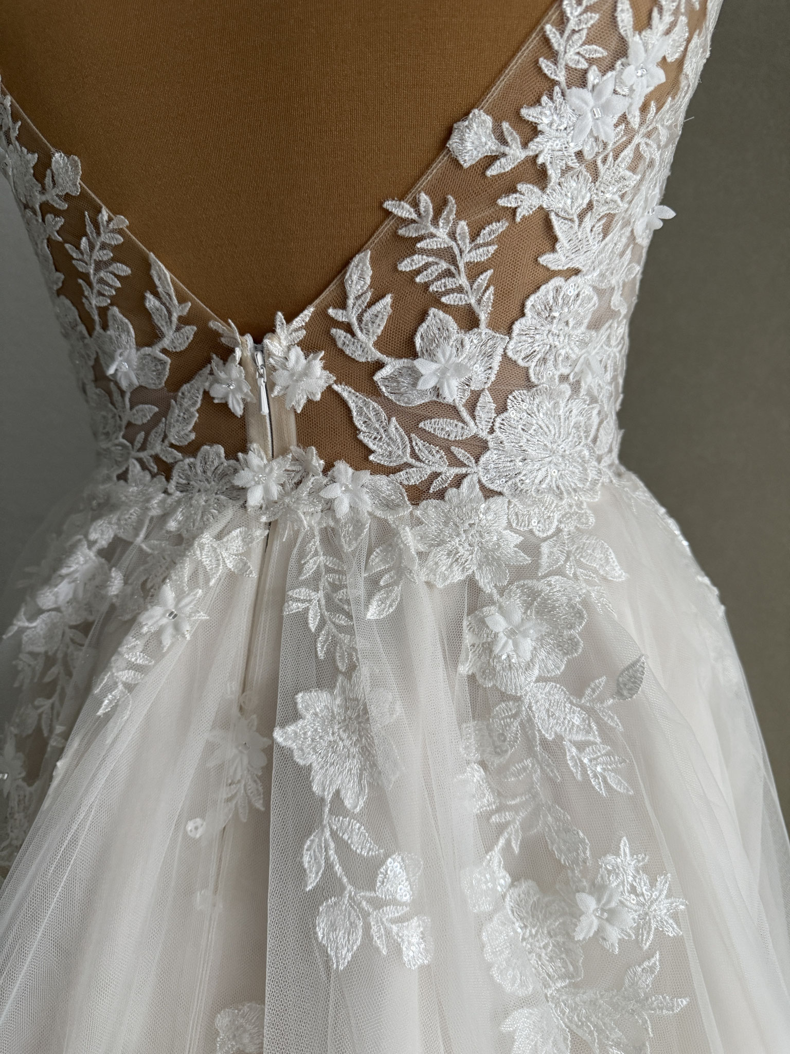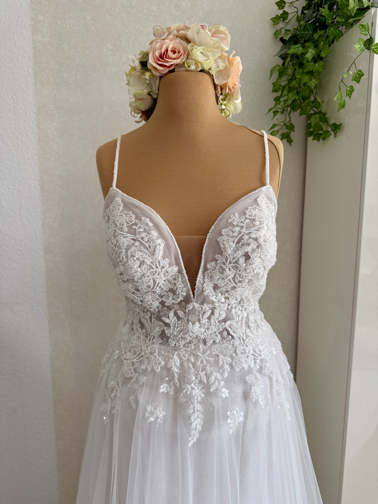 aus funkelnder Spitze mit Softtüllrock und Perlenträgern